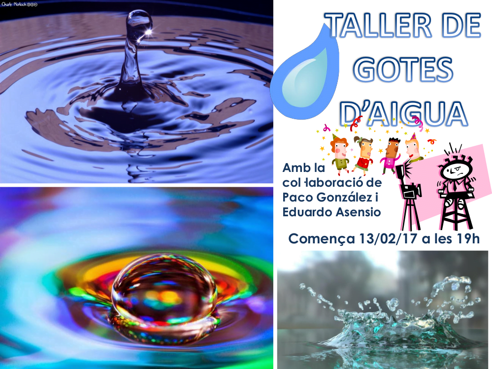De moment i per fer boca volem començar amb un taller de «Gotes d’aigua» que els nostres companys Paco González i Eduardo Asensio conduiran amb molta paciència. Aquest taller està previst començar-lo el 13 de febrer (horari: a partir de les 19 h)